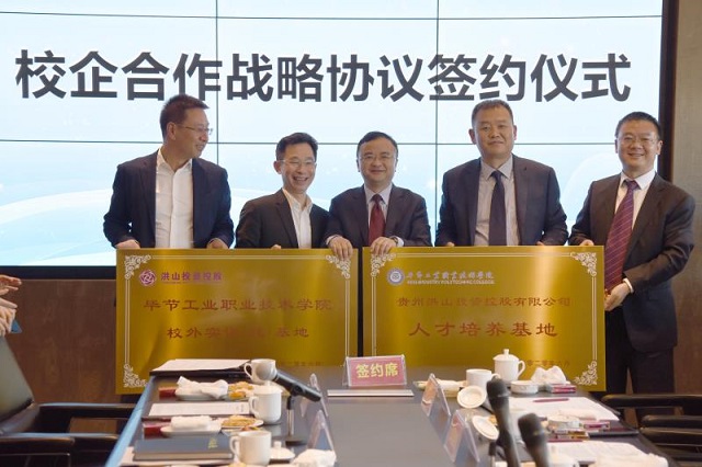 隨后,貴州洪山投資控股有限公司董事長金烈森和學院院長邱國援簽訂了校企合作戰略協議書,并完成授牌儀式。