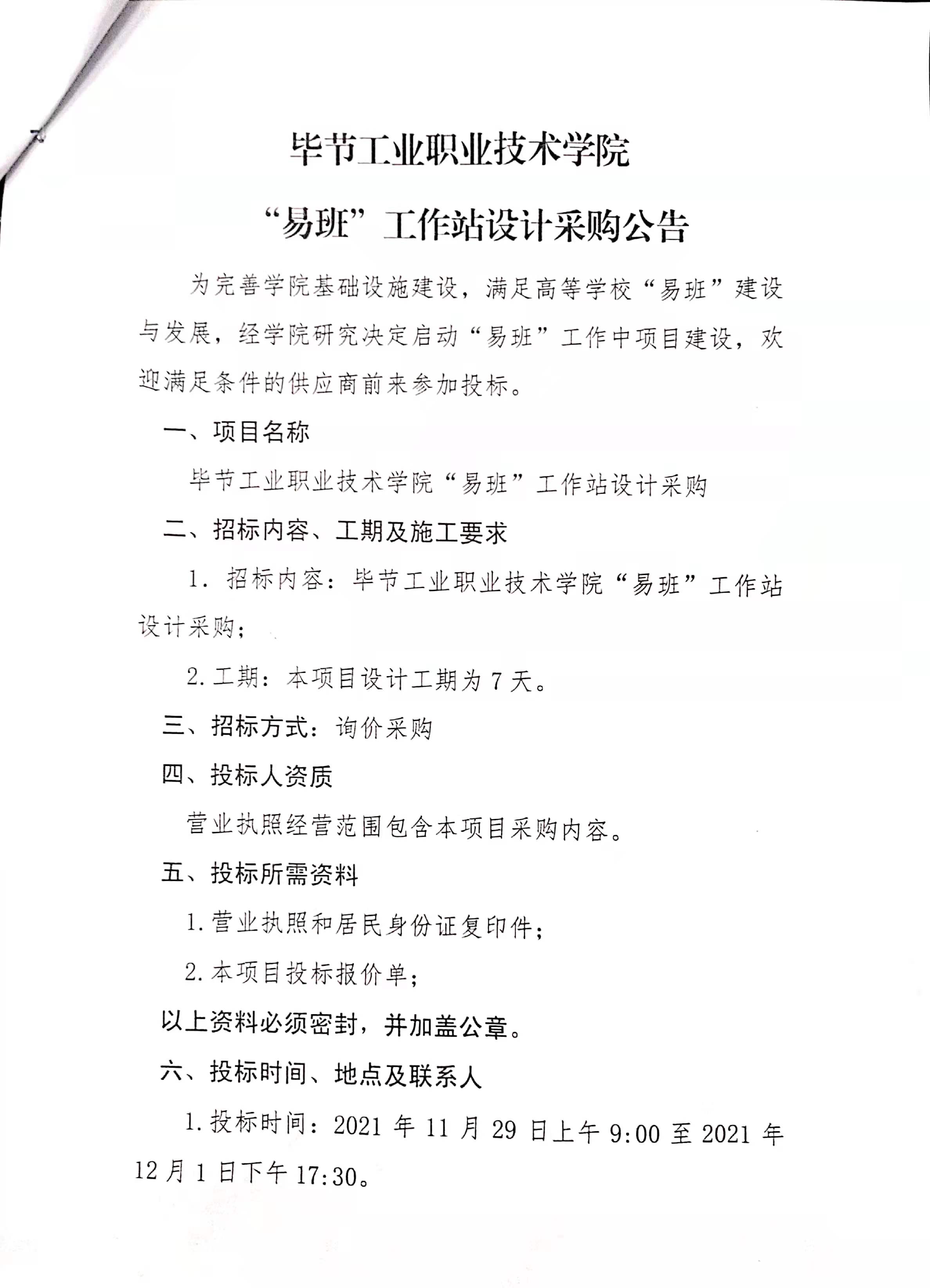 畢節工業職業技術學院“易班”工作站設計采購公告