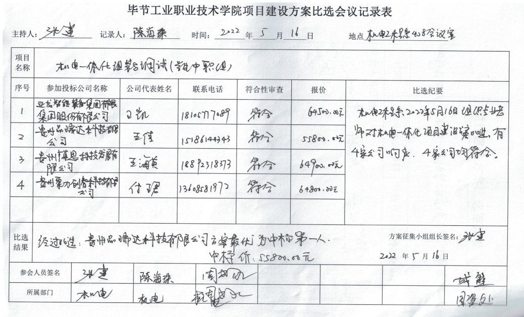 畢節工業職業技術學院機電一體化(中職組)省賽設備設備項目征集方案比選結果公示