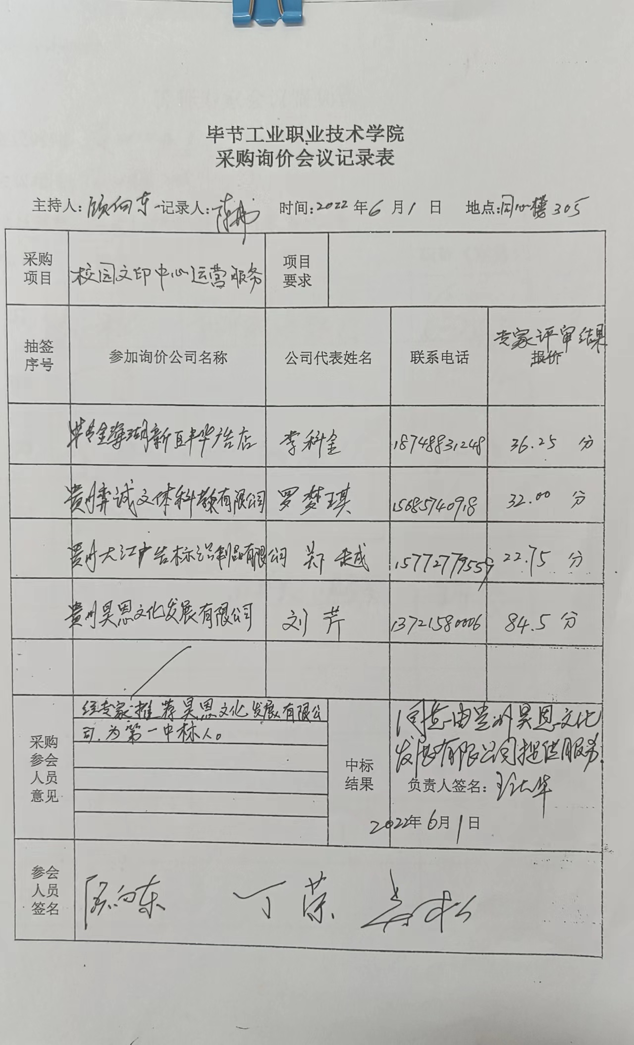 畢節工業職業技術學院采購詢價會議記錄表公示