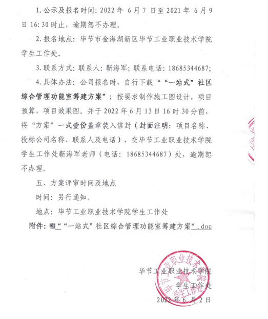為深入學習貫徹習近平總書記關于教育的重要論述,適應新形勢新情況,加強高校黨的建設和思想政治工作的重要體制創新,加強學生社區綜合管理,推動黨的建設、思政力量、管理力量、服務保障等深入學生一線,逐步打造富有中國特色體現思政要求、貼近我院實際、貼近學生實際的生活園區。根據《中共畢節工業職業技術學院委員會“一站式”學生社區綜合管理建設工作方案》,特制定本籌建方案。