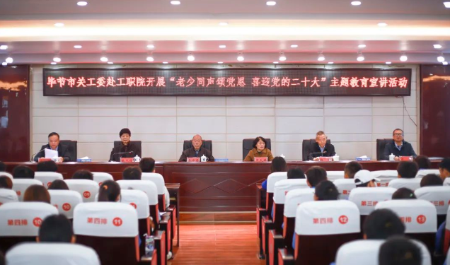 5月20日,畢節市關工委主任周長琦、副主任吳學香、楊旭、張志俠、梁軍一行受邀赴我院開展“老少同聲頌黨恩·喜迎黨的二十大”主題教育宣講,并實地調研我院辦學情況。學院黨委班子成員李涌、邱國援、付善華、黃文碧、申開谷,工會、婦聯主席李淑文及相關部門人員陪同調研。宣講會由黨委副書記付善華主持,學院師生代表200余人聆聽宣講。