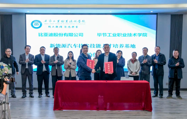 11月10日,畢節(jié)工業(yè)職業(yè)技術(shù)學院與比亞迪汽車股份有限公司、行云新能科技(深圳)有限公司開展“比亞迪新能源汽車技術(shù)技能人才培養(yǎng)基地”簽約儀式。學院黨委副書記、院長邱國援,畢節(jié)市教育局黨組成員、副局長金莉,比亞迪西南地區(qū)人力資源總監(jiān)蔣平,行云新能科技(深圳)有限公司副總經(jīng)理王克靜出席儀式。學院、比亞迪、行云新能相關(guān)領(lǐng)導及學院汽車工程系師生代表參加儀式。儀式由學院黨委委員、副院長吳家文主持。