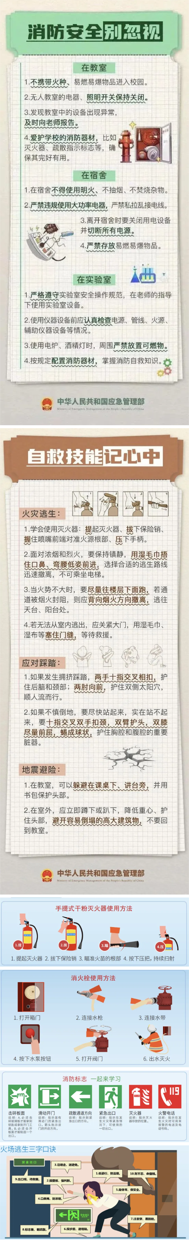 6. 熟悉消防安全常識(shí),掌握消防基本技能,做到“三懂、三會(huì)”:懂火災(zāi)的危害性、懂火災(zāi)的撲救方法、懂預(yù)防火災(zāi)的措施;會(huì)報(bào)火警、會(huì)使用滅火器、會(huì)逃生自救。