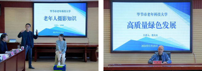 授牌儀式結束后,市老年科技大學副校長文勁松、市老科學技術工作者協會智庫專家曾慶良分別開展了《老年人攝影知識》和《高質量綠色發展》現場授課。