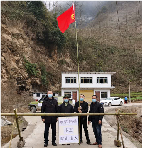 (圖2:畢節(jié)工職院派駐青山村第一書記趙澤龍帶領(lǐng)村干部在青山村卡點(diǎn)開展防控值守)