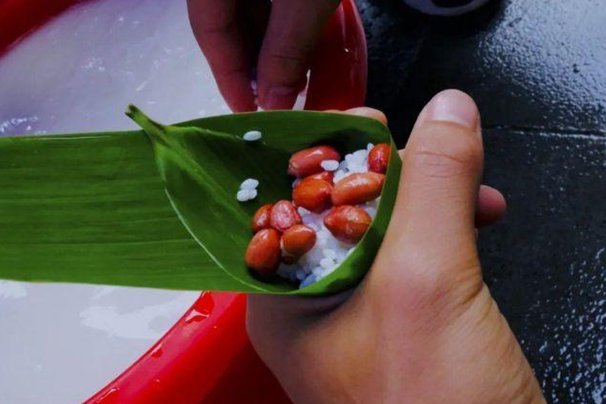 看著同學們嫻熟的手法,捻起一片粽葉,三兩下卷成漏斗狀,再舀起一勺米和紅棗倒入粽葉中,隨后用粽葉把糯米包裹緊實,系上繩子,一顆顆肥碩的粽子就這樣完成了。