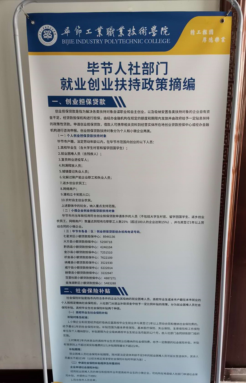 為了助力大學生創新創業,我院向需要幫助的同學提供了畢節人社部門的就業扶持政策,讓同學們在創業就業的路上少走彎路。