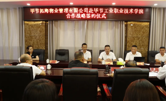 為深入貫徹落實習近平總書記對技能人才工作重要指示精神,切實做好新時代技能人才工作,9月3日,畢節拓海物業管理有限公司與畢節工業職業技術學院校企合作戰略協議簽訂儀式在學院同心樓三樓會議室舉行。畢節拓海物業管理有限公司總經理楊月強、常務副總經理邱鋒一行,學院黨委書記李涌,黨委副書記、院長邱國援,黨委委員、副院長吳家文、相關部門負責人及教師代表出席儀式。簽約儀式由邱國援主持。